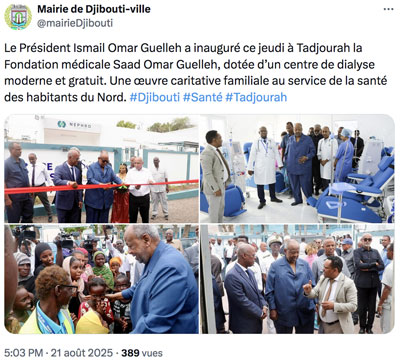 Le président de la République a participé ce 21 août à l’inauguration d’un centre de dialyse à Tadjourah. Ce dernier dispose d’une unité pouvant traiter sept patients, et devrait à terme pouvoir en accueillir quinze simultanément. Le personnel est composé d’un néphrologue – médecin spécialiste des reins – de quatre infirmières et de deux techniciens chargés de l’entretiens des appareils de dialyse et de traitement de l’eau.