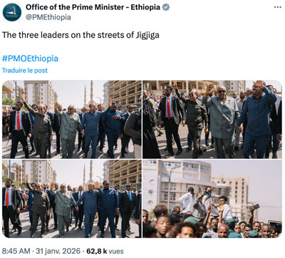 Ismaïl Omar Guelleh s’est rendu ce 31 janvier à Jiiga, en Éthiopie, pour participer à l’inauguration d’un complexe touristique, en compagnie d’Abiy Ahmed, Premier ministre éthiopien, et de Hassan Sheikh Mohamud, président de la Somalie.