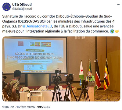 Aujourd’hui s’est tenue la cérémonie de signature de l’accord établissant l’Autorité du corridor Djibouti-Éthiopie-Soudan du Sud-Ouganda (DESSO) au Kempinski de Djibouti, en présence des ministres des transports des pays concernés, ainsi que de l’ambassadeur de l’Union européenne.