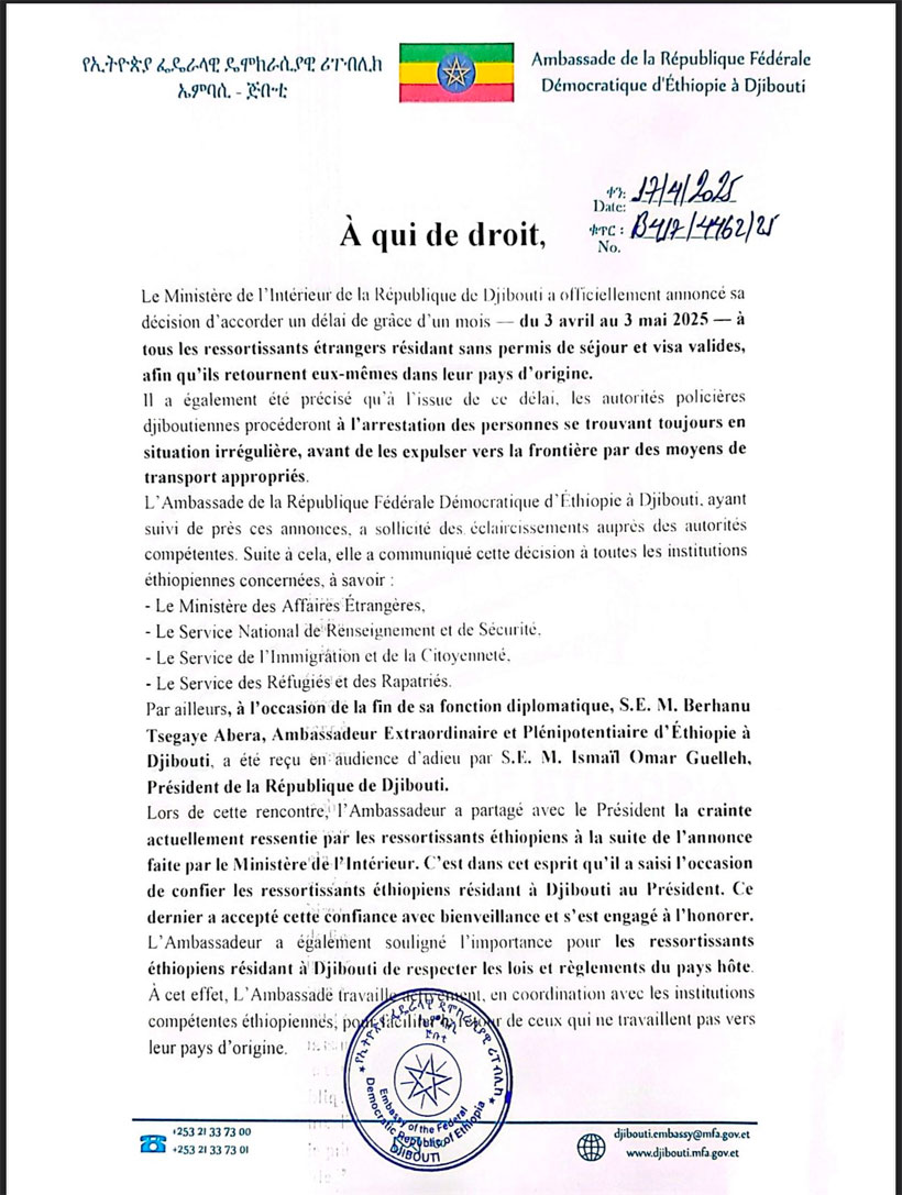 Le ministre de l’Intérieur, Said Nouh Hassan, a annoncé ce jeudi 3 avril 2025 ce qu’il présente comme une mesure-choc pour lutter contre l’immigration illégale : les étrangers en situation irrégulière sont invités à quitter volontairement et pacifiquement le territoire djiboutien dans un délai d’un mois. Passé cette échéance, les opérations de contrôle et de reconduite aux frontières seront intensifiées.