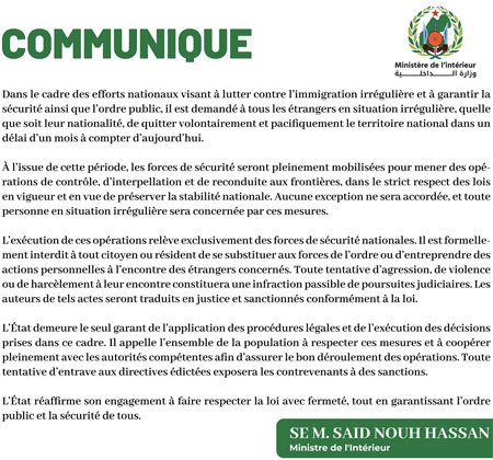 La priorité absolue est le respect des lois et la protection des citoyens, a martelé Said Nouh Hassan, en insistant sur le caractère ferme mais équitable » de la mesure. Il a appelé les concernés à une coopération responsable, évitant ainsi des mesures coercitives après le 3 mai 2025.