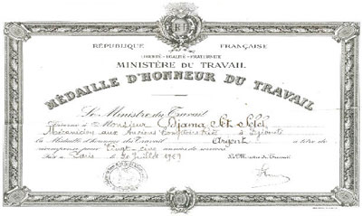 Son parcours professionnel sera sanctionné par l’obtention en juillet 1959 de la Médaille d’Honneur du Travail, délivrée après 25 ans de services. Cette décoration est décernée par le ministère du Travail de la République française aux travailleurs exemplaires, aussi bien alors dans l’Hexagone que dans les colonies.