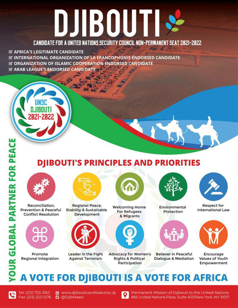 Pour clôturer mes propos et en souhaitant plein de succès à nos travaux, je voudrais attirer votre attention et quérir votre appui en faveur de la candidature de la République de Djibouti comme membre non permanent au Conseil de sécurité de l’Organisation des Nations Unies, lors des élections de renouvellement qui auront lieu en juin 2020.